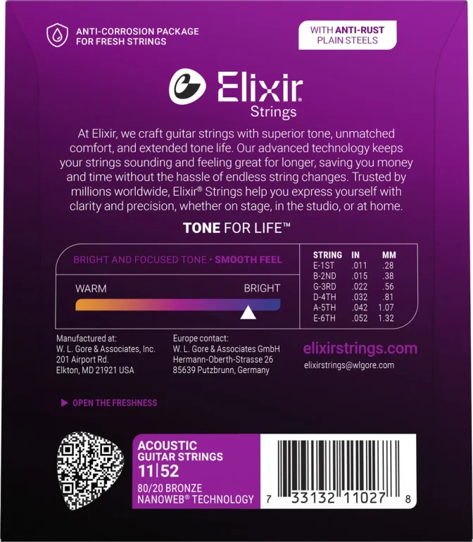 Elixir® Acoustic 80/20 Bronze Strings with NANOWEB Coating deliver a bright, lively tone together with extended tone life that players have come to expect from Elixir Strings.
